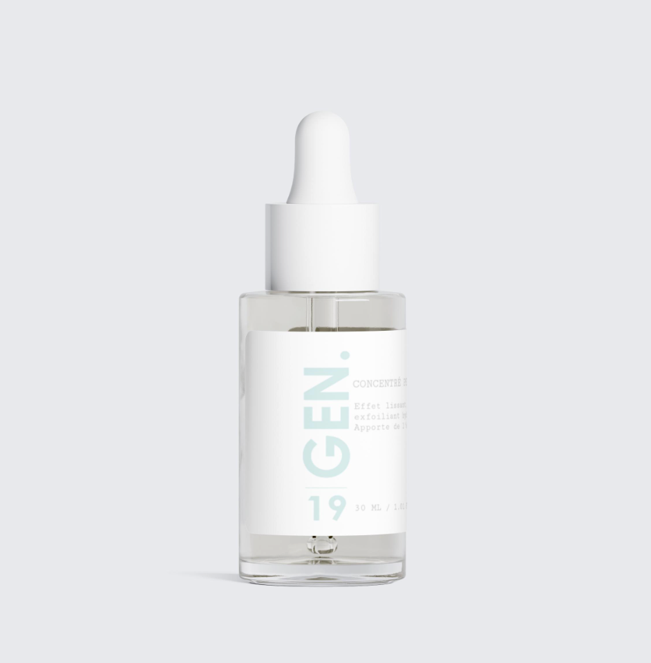 le AHA Peeling concentré GEN.19 : Peeling doux formulé avec 10 % d'acide lactique qui élimine les cellules mortes et favorise le renouvellement de la peau.